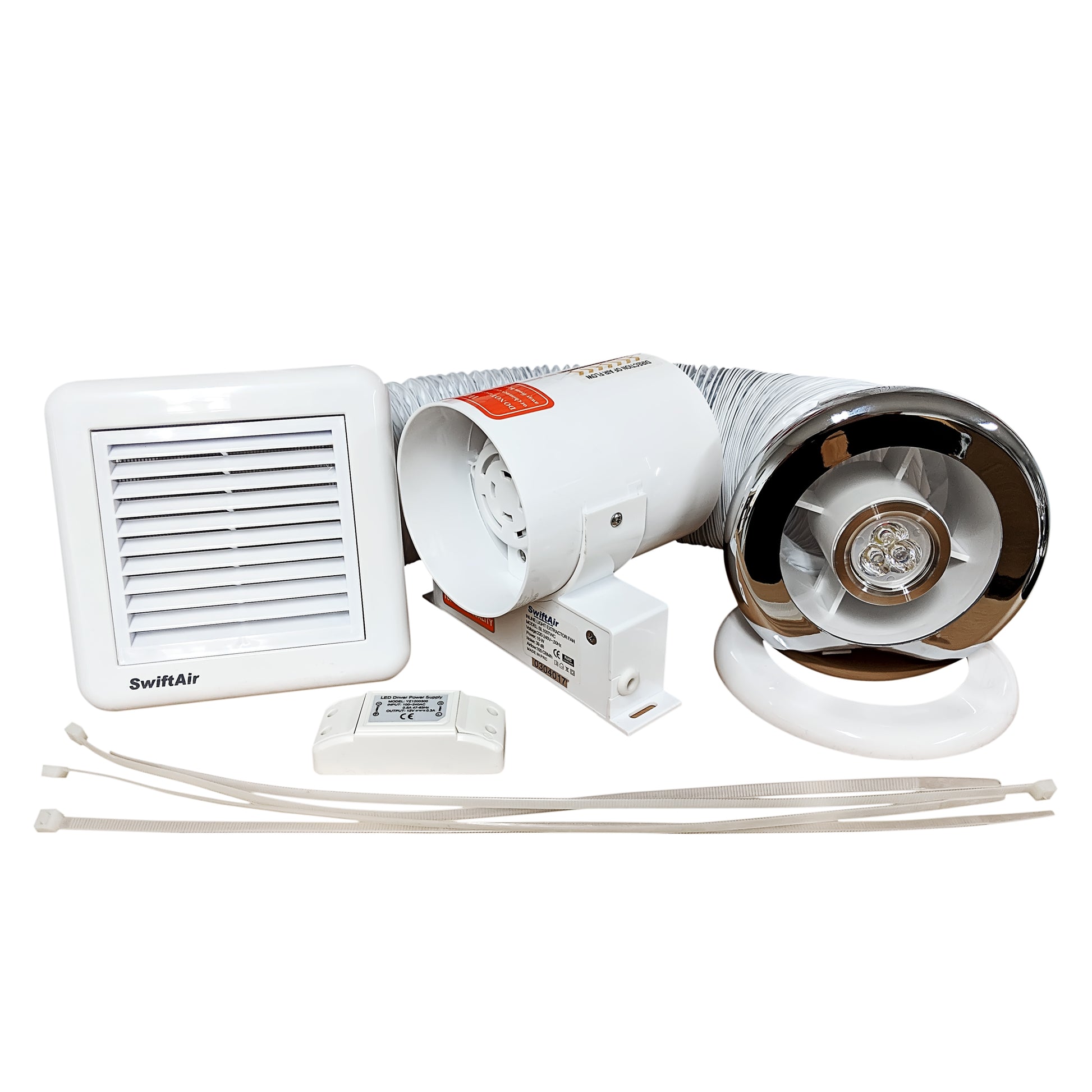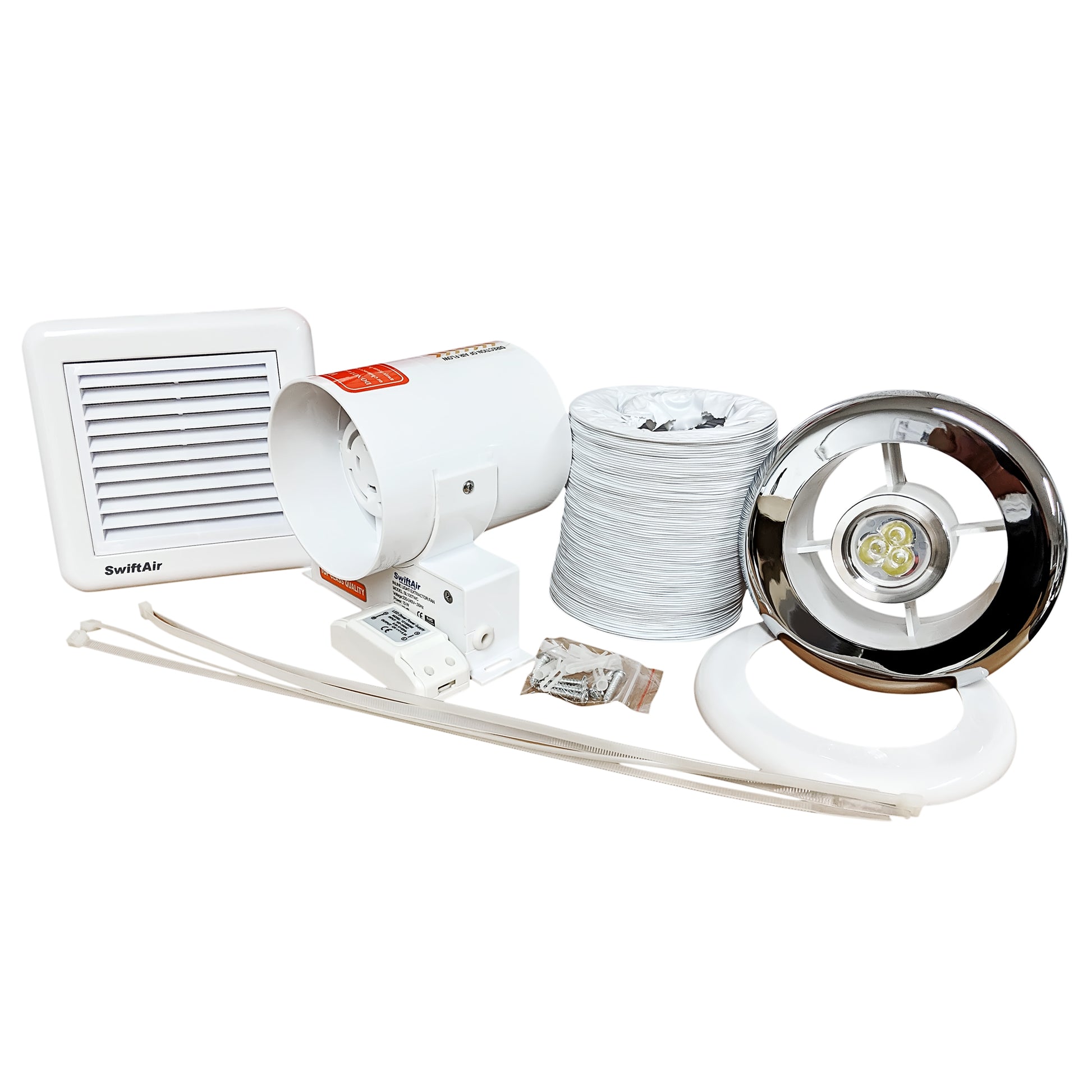 Available with timer, the fan kits are supplied complete with fan unit, one length of PVC flexible ducting 3m, one internal Grille and one external white wall grille, fixing screws, plugs and straps to secure the duct and the grilles.