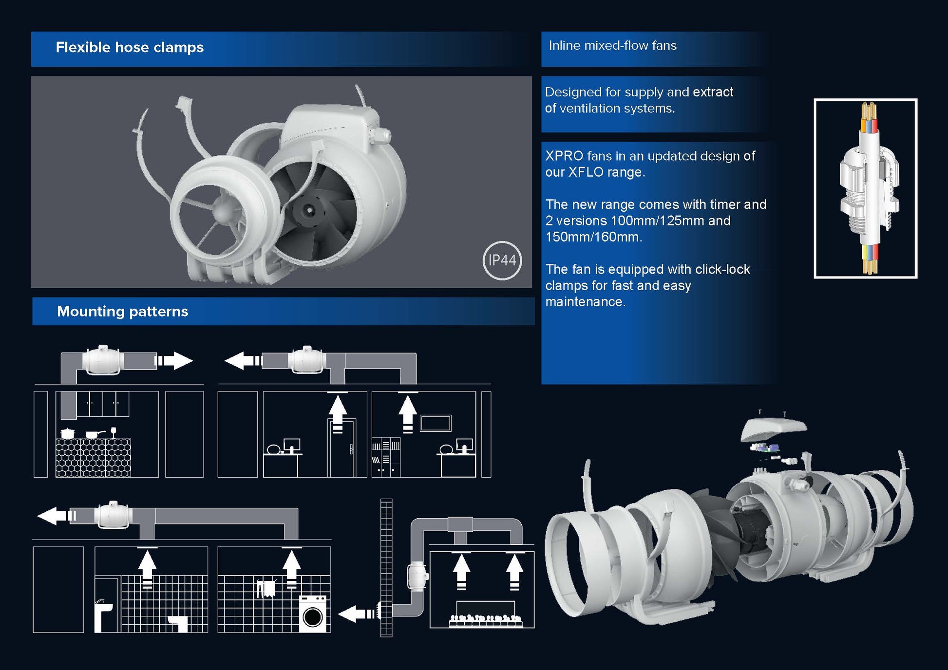 Our XPRO range is quiet, powerful and high performance. Mixed Flow fans are less bulky than large in-line centrifugal fans and can be installed in loft spaces or service shafts. This range is specially designed for residential applications. It is also supplied with a mounting bracket for quick and easy installation on wooden joists and panels. XPRO fans are suitable for removing damp moist air, odours and airborne pollutants from bathrooms, en-suites, shower rooms and utilities.